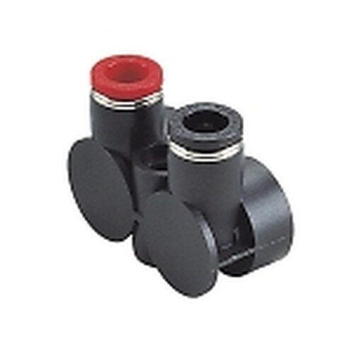 2ラインを同時に確保できる連結型集中分配継手。接続は、はめ込み式。ブロックの増減も可能。ライン毎に開放リングを色分け。冷却水の配管にも使用可能。 |