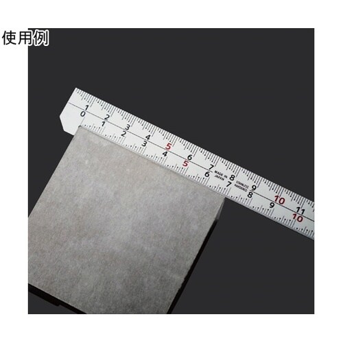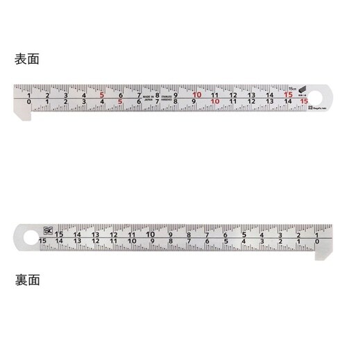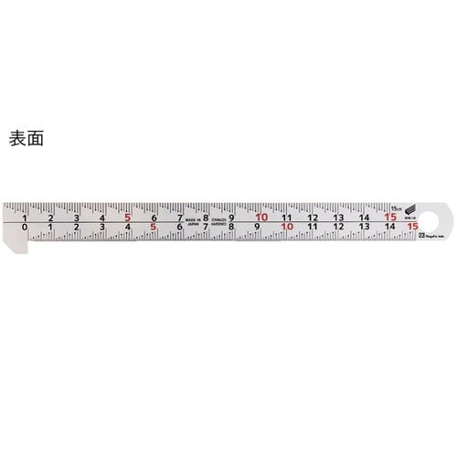 ワークに引っ掛けて測定が出来るフック付です。両面目盛で裏面も使えます。1mm単位の目盛が見やすく、数値を瞬時に把握できる連続追数字表示+2mm点付の階段状目盛です。 |