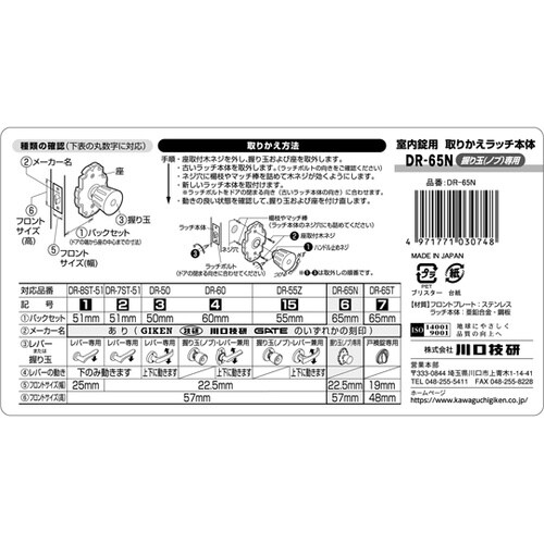 握り玉錠専用の取替えラッチ本体です。枠の変形、ドアの反り等で、ラッチボルトの掛かりが悪くなった場合には、専門業者に相談し修正が必要です。修正しないで使い続けますと壊れる原因になります。 |