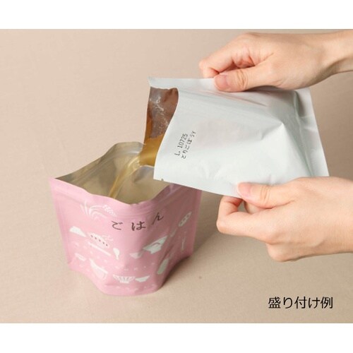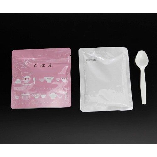 スープでもどすアルファ化米です。水要らず、この一袋に全て入っています。 |