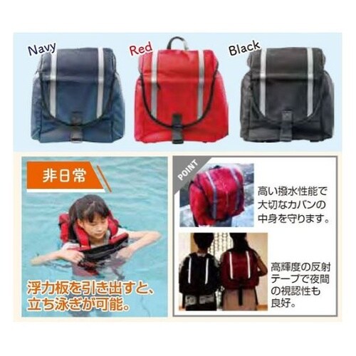 子どもの行き帰りに安心をプラス高い撥水性能で雨天時も中身をガード、水に浮いても中身はぬれません。高輝度の反射テープで夜間の視認性も良好です。