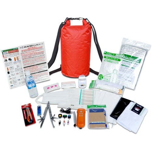 オフィス・学校からの帰宅・職場内避難時の必需品の豊富な内容物。バッグは、水12Lの運搬・貯蔵や、空気枕にも、大人(体重110kgまで)の浮き具としても使えます。 |