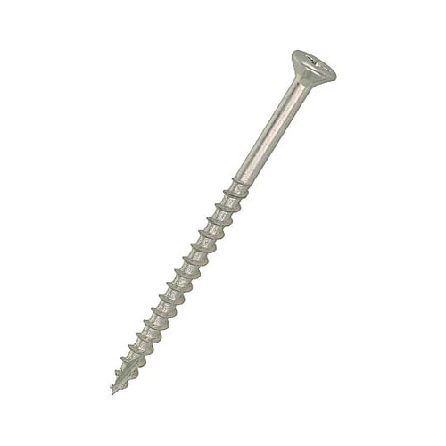 材質は鉄で、三価クロメートめっき。電動ドライバーを使用でき、下穴が不要。自ら座ぐりをして頭部を材中に埋める。木用ねじより細く、先端が鋭いVカットになっており、木割れを防ぐ。ドライバー2番。 |
