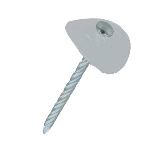 材質は釘が鉄で、ユニクロめっき。傘が、樹脂(PE)塩化ビニール、ポリエステル波板などの取り付けに使用。