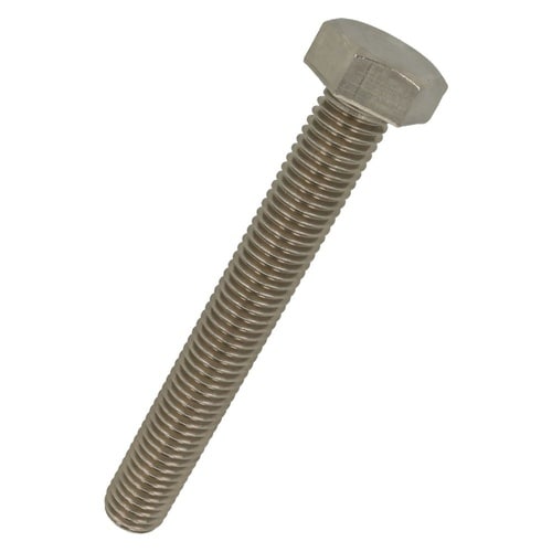 六角形状の頭部があり、胴の全体にねじが切ってあります。ステンレス鋼(SUS304系)なので耐食性、耐熱性に優れています。機械類の位置調整、締結用ねじです。