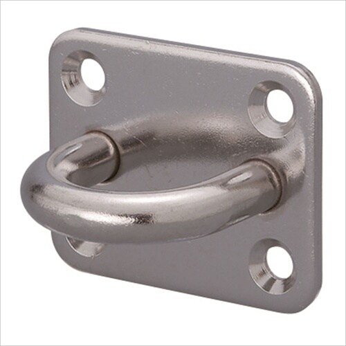 材質はステンレスでサビにくい。木部にビスで固定し、ロープ通しや物を吊り下げる際に使用。 |