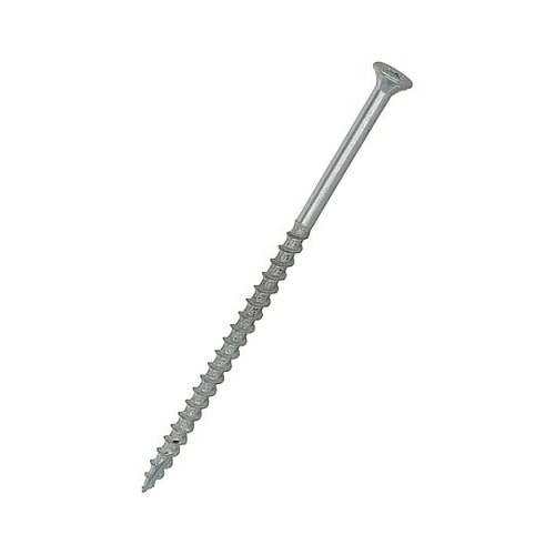 材質は鉄で、三価クロメートめっき。電動ドライバーを使用でき、下穴が不要。自ら座ぐりをして頭部を材中に埋める。木用ねじより細く、先端が鋭いVカットになっており、木割れを防ぐ。ドライバー2番。 |