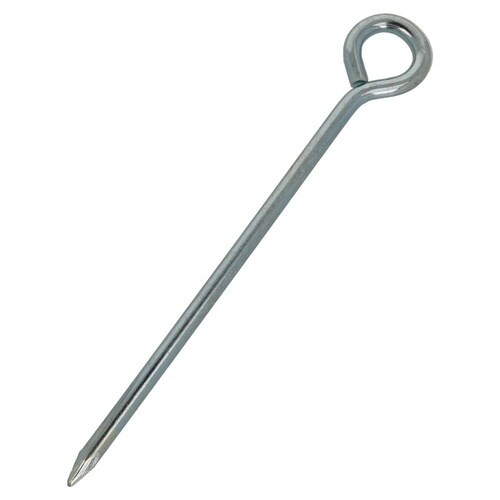 材質は鉄でユニクロめっき。地面に打込み、キャンプ時のテント張りや駐車場のロープ張りなどに使用。 |