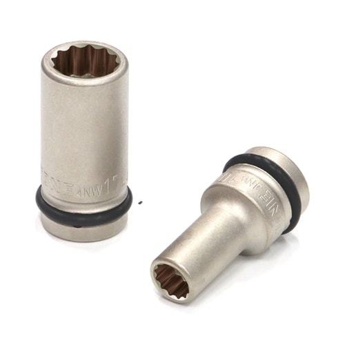 外観品質と防錆力の向上を図った無電解めっき仕様のインパクト用ロングソケット。12角部ストロングドライブ。Oリング、ピンは正しいサイズのものを確実に固定してから使用してください。 |