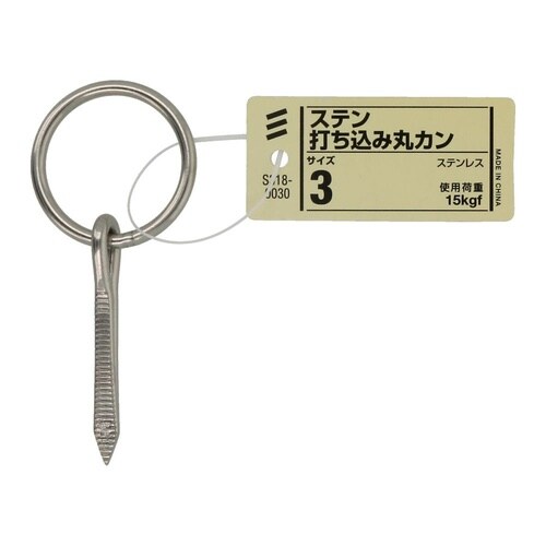 材質はステンレス(SUS304)でサビにくい。木材に打込み、リング部にロープを止め使用。テントなどを固定する時に使用。 |