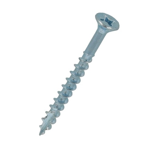 材質は鉄で、三価クロメートめっき。電動ドライバーを使用でき、下穴が不要。自ら座ぐりをして頭部を材中に埋める。木用ねじより細く、先端が鋭いVカットになっており、木割れを防ぐ。ドライバー2番。 |