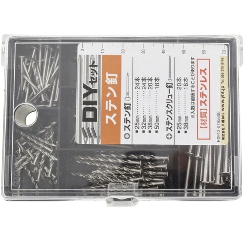 材質はステンレスで錆びにくいです。ステン釘とステンスクリュー釘の2種類のセット商品です。木製パレット、梱包材などに使用します。 |