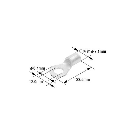 幅:12.0mm | 全長:23.5mm | 穴径:6.4mm | 圧着部内径:Φ4.5mm | 適用電線:8.00mm2 | 板厚:1.2mm | …