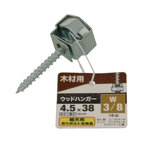 ねじ部・ナット部の材質は鋼で、ユニクロめっき。吊りボルト取付工事の省力化に。木材下地にW3/8の吊りボルトを固定する際に使用します。 |