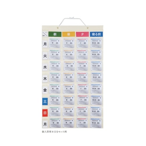 配薬管理に便利なダブルポケット仕様のお薬カレンダー。前ポケットに氏名表示、後ポケットに薬をいれることができ、最大8日分のお薬を管理できます。 |