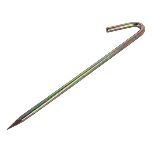 材質は鉄で、クロメートめっき。サイズ=太さX全長(mm)。ゲートボールなど境界線のロープを止める金具として使用。
