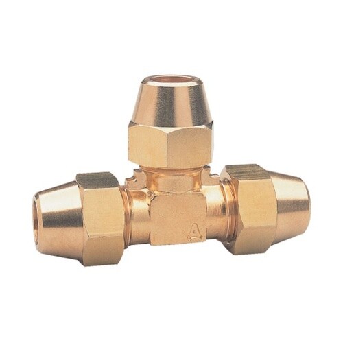 銅管を拡管して接続するフレアー式継手(三方チーズ)となります。本体とナットで挟み込み締め付けているため、気密性が優れています。流体の分岐に使用できます。 |