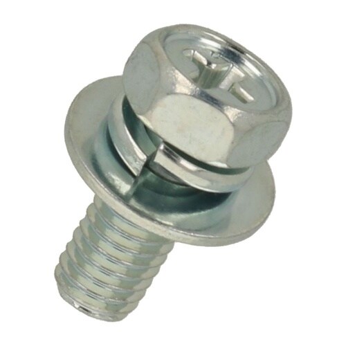 六角アプセットボルトにばね座金と平座金が組込まれており脱落しません。組込み式なので作業効率が向上します。締付け工具はボックスレンチ、メガネレンチ、十字ドライバーが適切です。 |