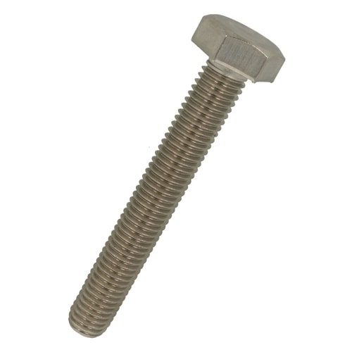 六角形状の頭部があり、胴の全体にねじが切ってあります。ステンレス鋼(SUS304系)なので耐食性、耐熱性に優れています。機械類の位置調整、締結用ねじです。