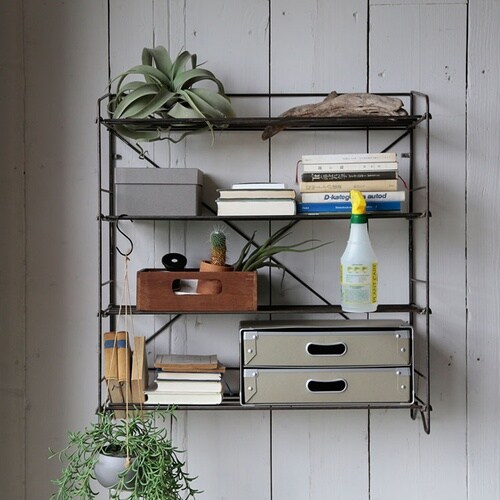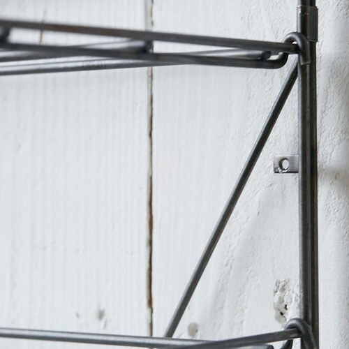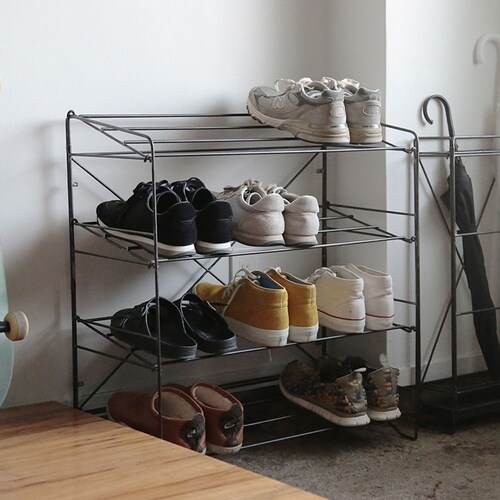 抜け感のあるシンプルなワイヤー製のシューズラックと傘立て。極限まで無駄を省いたデザインでお部屋に調和します。シューズラックは棚角度を水平か斜めでお好みで変えられるようになっています。 |
