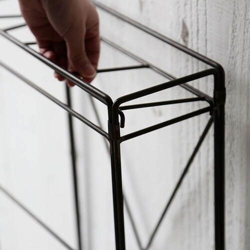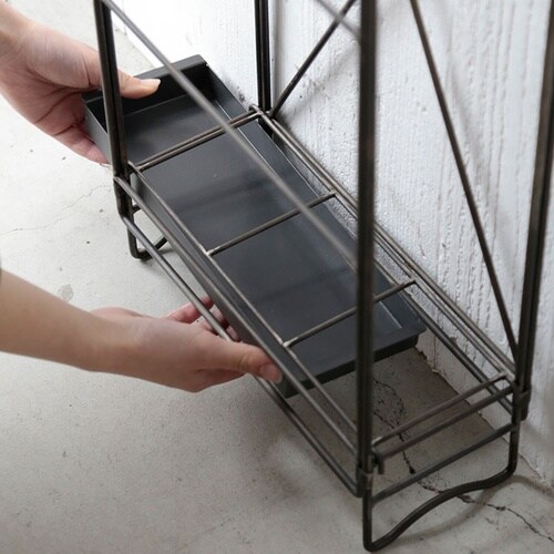 抜け感のあるシンプルなワイヤー製のシューズラックと傘立て。極限まで無駄を省いたデザインでお部屋に調和します。シューズラックは棚角度を水平か斜めでお好みで変えられるようになっています。 |