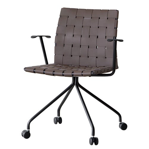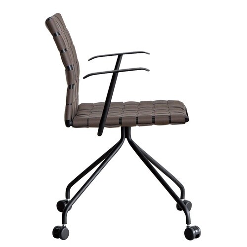 レザーを編み込んだ座面とスチールフレームで構成された、モダンなキャスター付きオフィスチェアです。 |