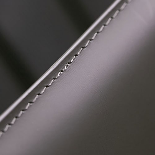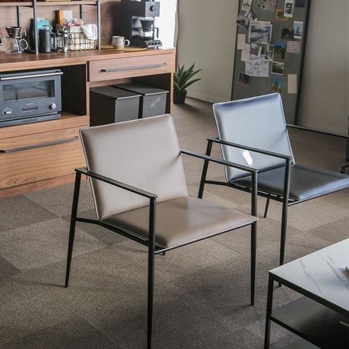 滑らかな質感のリサイクルレザーをシートに使ったスタイリッシュなラウンジチェア。シャープでどの角度から見ても美しく洗練された様は空間をモダンにブラッシュアップします。背面のベルト留めもアクセントに。 |