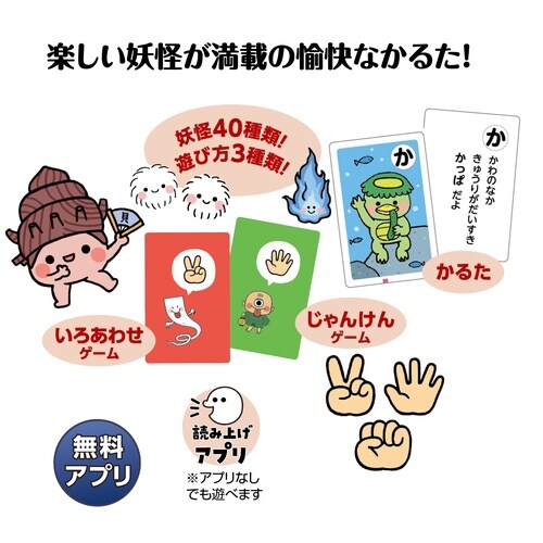 読み上げアプリ付き!楽しい妖怪が満載の愉快なかるた!40種類の妖怪が登場する楽しいかるたです。各種妖怪の説明も書かれています。 |