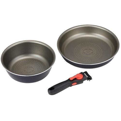 取り外し可能な脱着式ハンドルと、24cm・20cm深型フライパンの便利な3点セットです。微細粒子の人工ダイヤモンドをふっ素樹脂に配合した磨耗に強いコーティングです。 |
