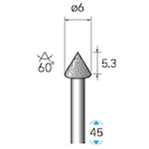 粒度(#):100 | 刃径(mm):6 | 刃長(mm):5.3 | 軸径(mm):3 | 全長(mm):45 | 最高使用回転数(rpm):670…