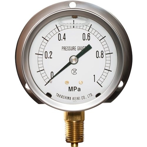 主要部分は全てステンレス(目盛板など機能的に必要ない部分は一部除く)として、堅牢で耐久性に優れています。密閉構造で使用場所を選ばないオールラウンド圧力計です。 |