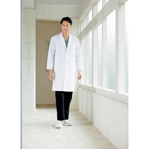 ベーシックな三つボタンの男性用シングルドクターコート(診察衣)は、シンプルなデザインで着心地の良い素材を使用しました。 |