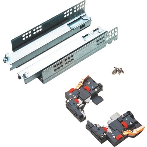 3段引のスライドレールです。スライドレールが外側から見えないため、キャビネットなどのデザイン性を損ないません。セルフ、ソフトクロージング機構は、閉じる約30mm手前から働きます。 |