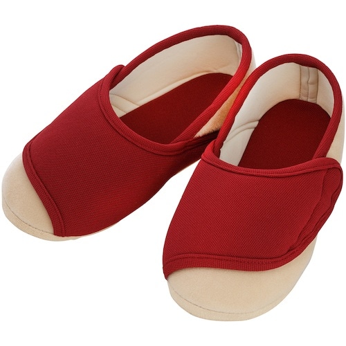 足囲7E相当のルームシューズです。どこにでも留まる幅の広いベルトです。広い開口部で足入れしやすいです。自宅、事務所履きに。スリッパ代わりに。足に腫れやむくみの症状のある方に。 |