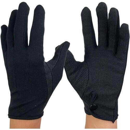 肌触りの良い綿100%を使用した黒色の手袋です。甲側にシャープに見せる3本飾りがついています。裾はホックで手首部分を固定できます。 |
