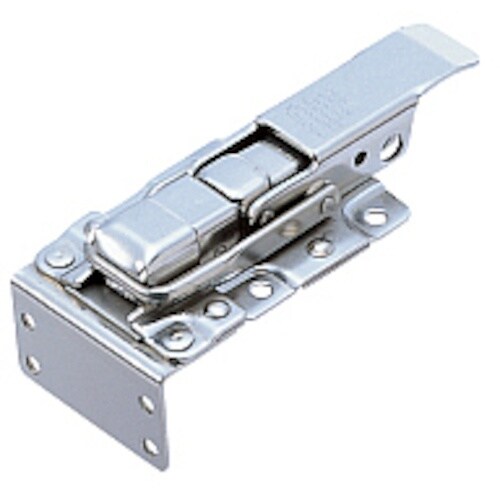 三方向からの揺れをしっかりとおさえるデッドボルト機構により、耐振性が抜群です。受座フックはL字形で、外コーナーに取り付けできます。セーフティーロック付仕様と、南京錠取付用穴付仕様があります。 |