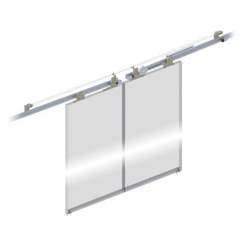 片側の扉を開けることにより反対側の扉も同時に開けることができます。1つの油圧制御装置と戸尻側ブレーキで2枚の扉を同時に制御します。レール傾斜は300mmに対し4mmの高低差になります。 |