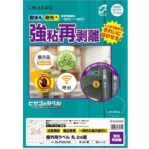 HISAGO ラベル 屋外ラベル強粘再剥離 丸24面 KLPH3019S 1冊(10枚)