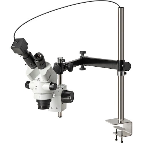 観察作業が楽なズーム式 & カメラで確認・保存自由度の高いロングアーム観察作業が楽に行えるズーム式の実体顕微鏡と、堅牢で取付ネジを多数備えた500万画素USBカメラのセットです。 |