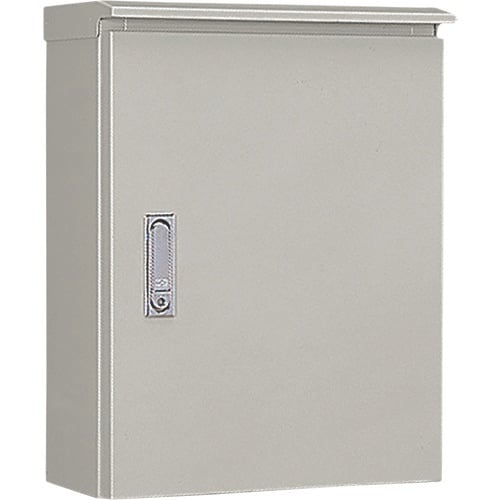 水切構造、防塵・防水パッキン付の屋外用制御盤キャビネットです。施錠可能な防水平面ハンドルを採用しています。(キーNo.N200)屋外用の盤用キャビネットとしてもご利用ください。 |