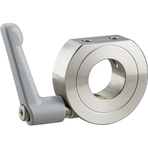 特殊形状のクサビにより少ない力で締め付けが可能なクサビカラーです。クランプレバー付のため、工具なしで簡単に締め付けができます。Dカット面のネジ穴を利用してブラケットなどを取り付けることができます。 |