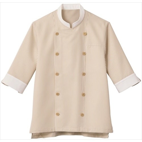 爽やかストライプの衛生対策機能が充実したショップコートです。塩素系漂白剤による退色を防ぐ素材機能から、元の色合いが持続します。水仕事など、腕まくりの手間なく作業ができる七分袖。 |