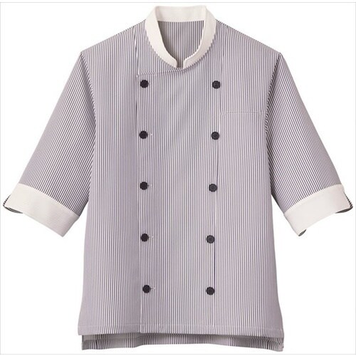 爽やかストライプの衛生対策機能が充実したショップコートです。塩素系漂白剤による退色を防ぐ素材機能から、元の色合いが持続します。水仕事など、腕まくりの手間なく作業ができる七分袖。 |