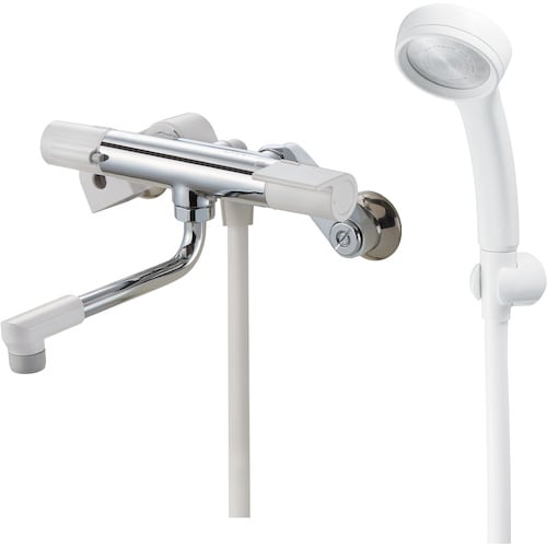適温キープ:サーモカートリッジの働きで湯水の混合量を自動で調整し、常に一定の温度を保つことが出来ます。クリック機構:切替ハンドルにクリック機構を採用しました。