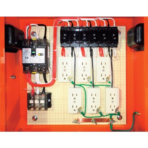 仮設電灯分電盤の標準型です。大阪府の自社工場で設計、製造しています。部分的な修正・変更から、フルオーダーまで、別作対応可です。工事現場のコンセント、照明や工具等の電源に。 |