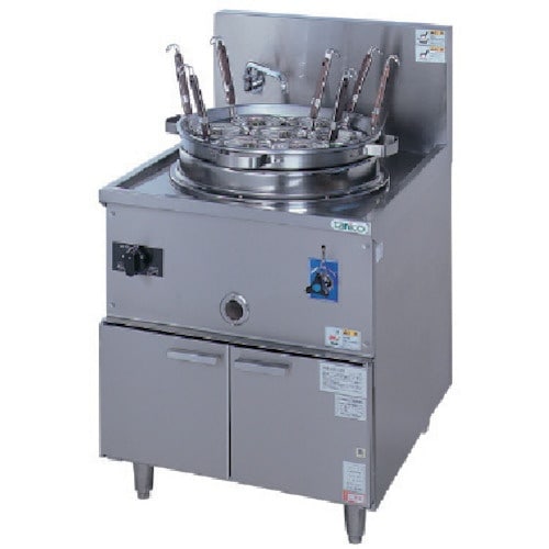 丸型ステンレス鍋にテボカゴ7個。余熱タンク付き。麺ゆで。 |