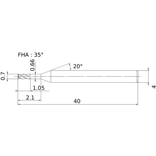 刃数ZEFP(枚):4 | 切削径DC(mm):0.7 | 最大切込みAPMX(mm):1.05 | 使用可能長さLU(mm):2.1 | 機能長さL…