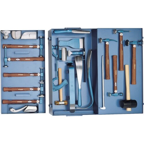 自動車の板金修理用工具25個が工具箱に入っています。自動車のボディのヘコミの修理に使用します。 |