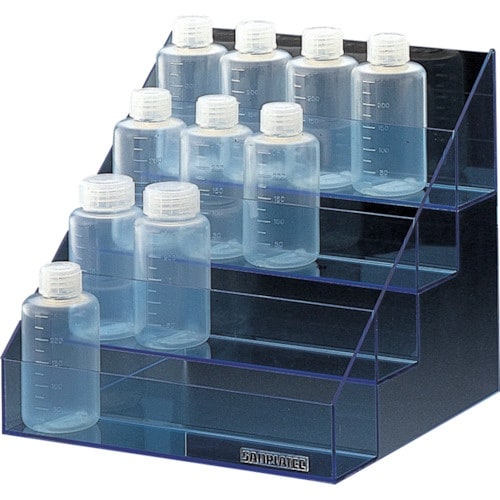 試薬ビンの収納がひな段式なので、薬品の種類が一目でわかり、取り出しも安全です。全面がクリアーブルーの塩化ビニール製で、耐薬品性に優れています。地震等の場合でも転倒することがありません。 |