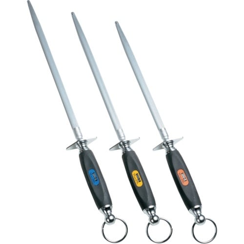 牛刀ヤスリ(スチール棒)は、刃先に脂が付いて、切れ味が悪くなった時に、脂を取り去ることや、刃先を傷めず、修正を行うために使用する道具です。 |